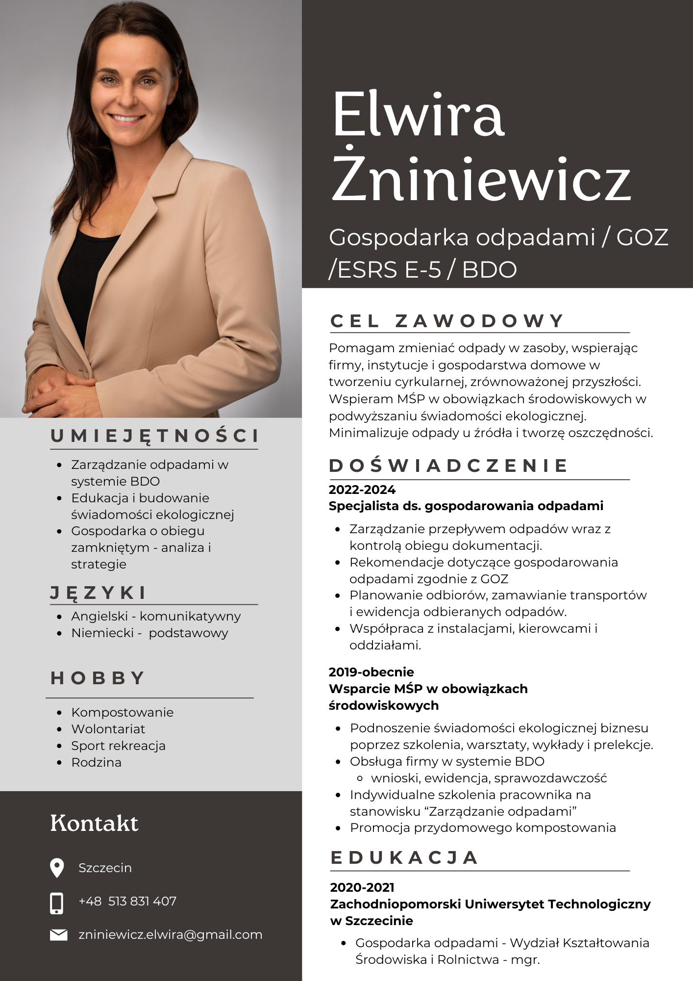 Ekspertka wspierająca małe i średnie przedsiębiorstwa (MŚP) w zakresie obowiązków środowiskowych, zarządzania odpadami, gospodarki o obiegu zamkniętym (GOZ) oraz zrównoważonego zarządzania odpadami (Sustainability Waste Management). Doświadczona wykładowczyni, edukatorka ekologiczna, praktyk w systemie BDO oraz promotor recyklingu organicznego.